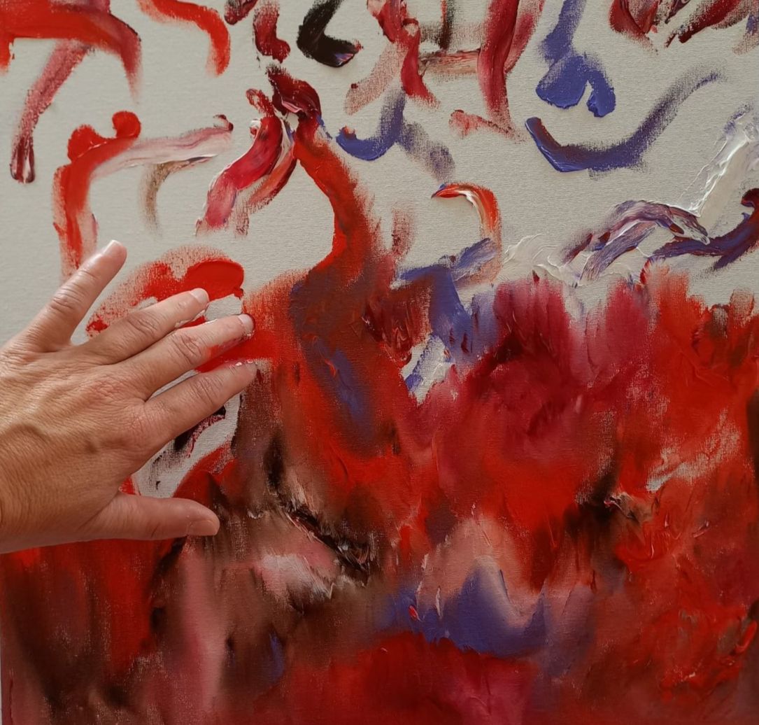 " Expérience extraordinaire, se laisser guider par une odeur, les yeux fermés, sentir et se laisser guider par Stéphanie. Pousser l'exploration en choisissant même les couleurs au hasard et se lancer. Les doigts sur la toile, contact direct avec la matière, oser le mouvement. Puis ouvrir les yeux et contempler. L'accompagnement de Stéphanie m'a permis de dépasser le premier jugement de ce qui était là devant moi, à revenir à mon corps et cœur, et voir ensemble ce qui avait besoin d'être transformé, précisé ou adouci.